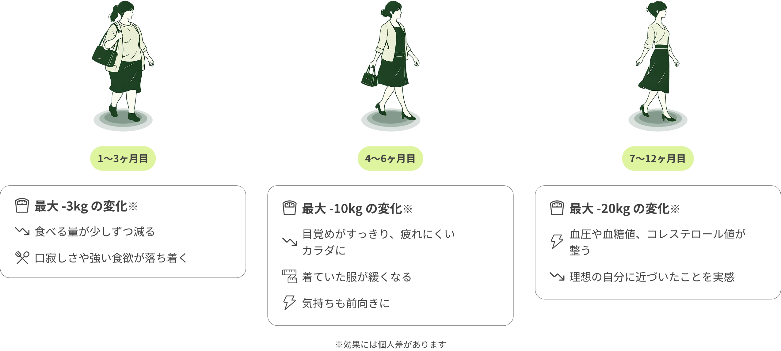 私たちのプログラムは、初期の減量サポートだけでなく、その後の体重維持までを見据えて設計されています。