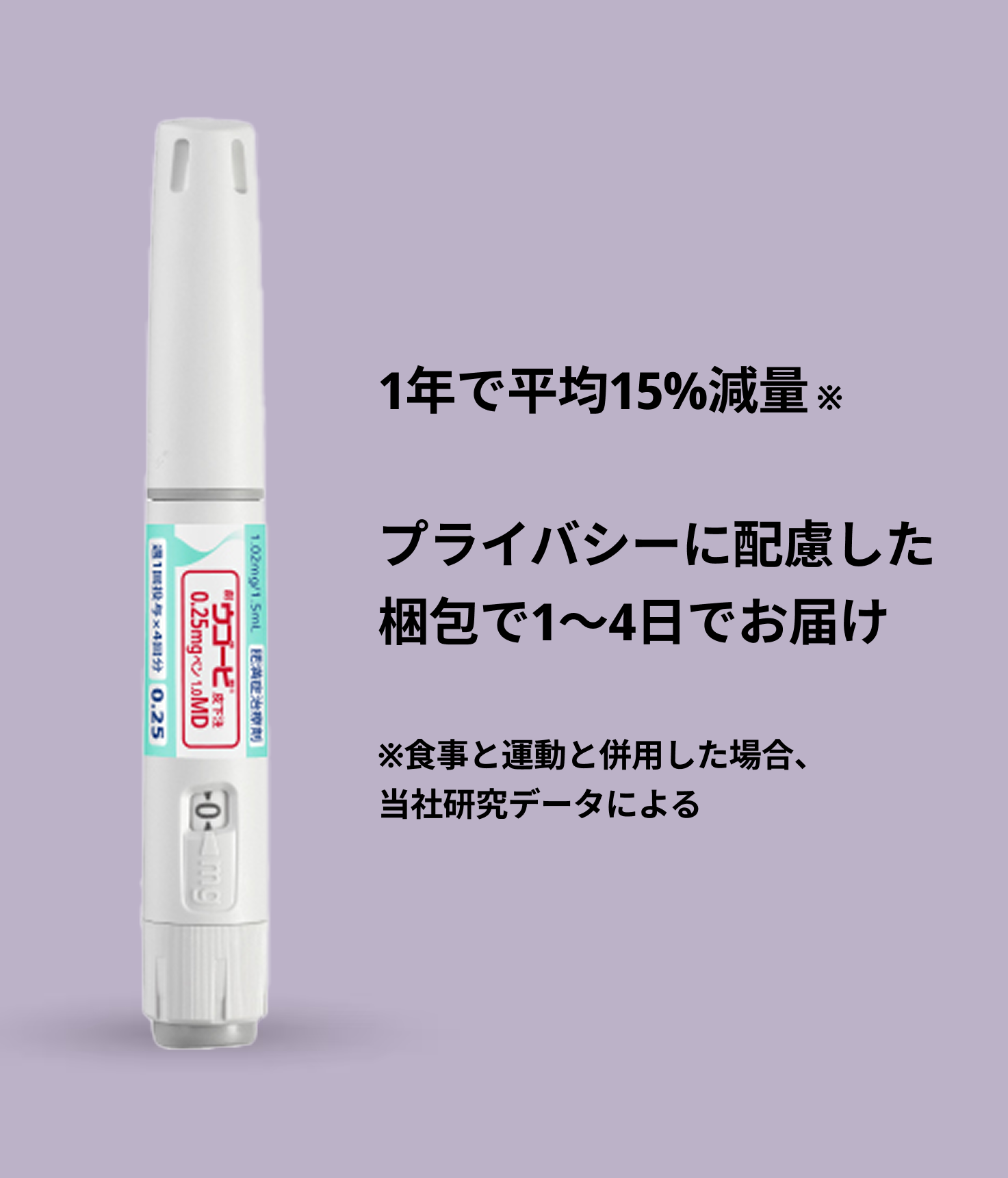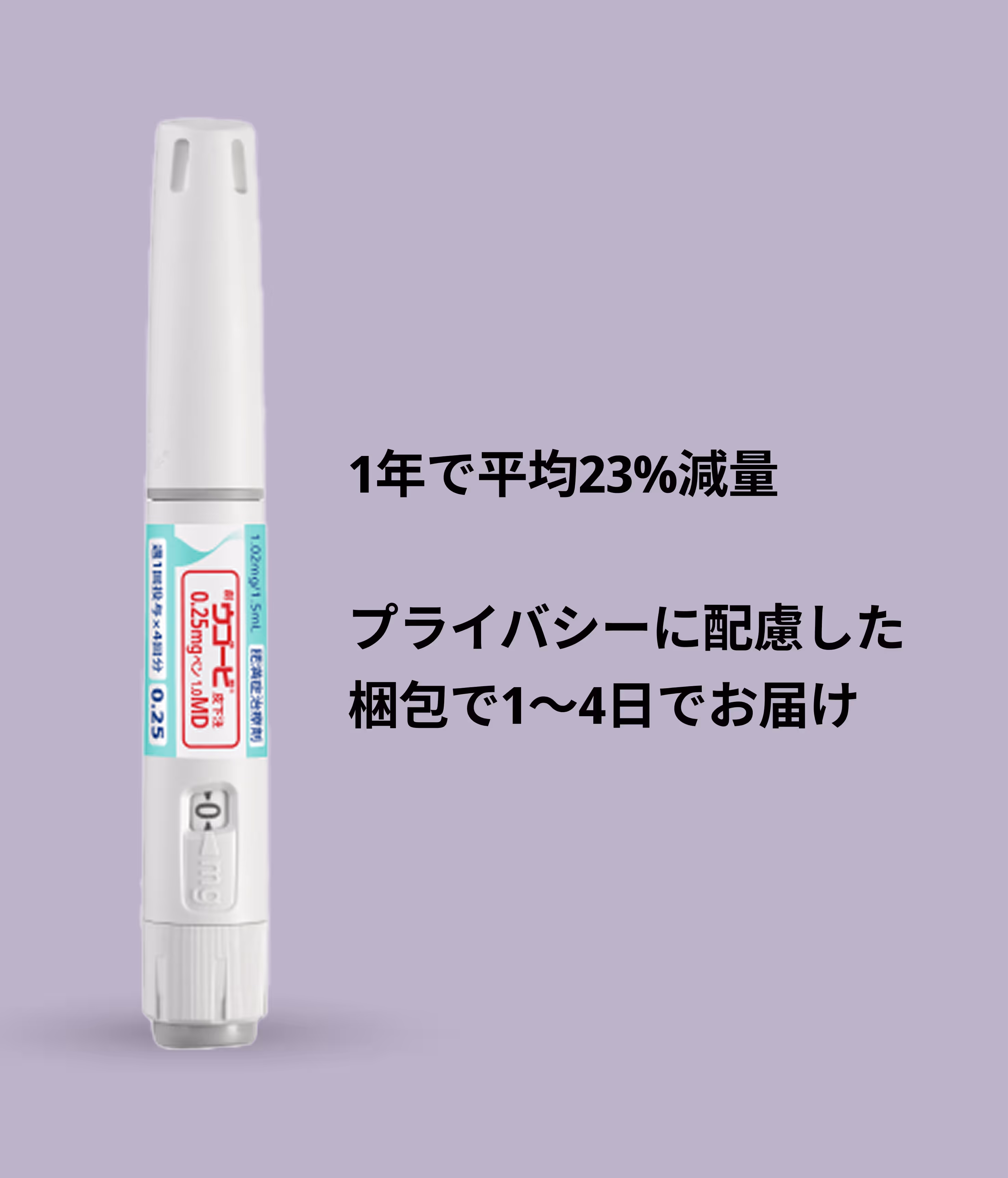 医師の診察を経て、正規のウゴービをお届け。週1回注射のGLP-1医薬品で、1本で4回分が含まれています。自宅で始められる、続けやすさを重視した新しい選択肢です。