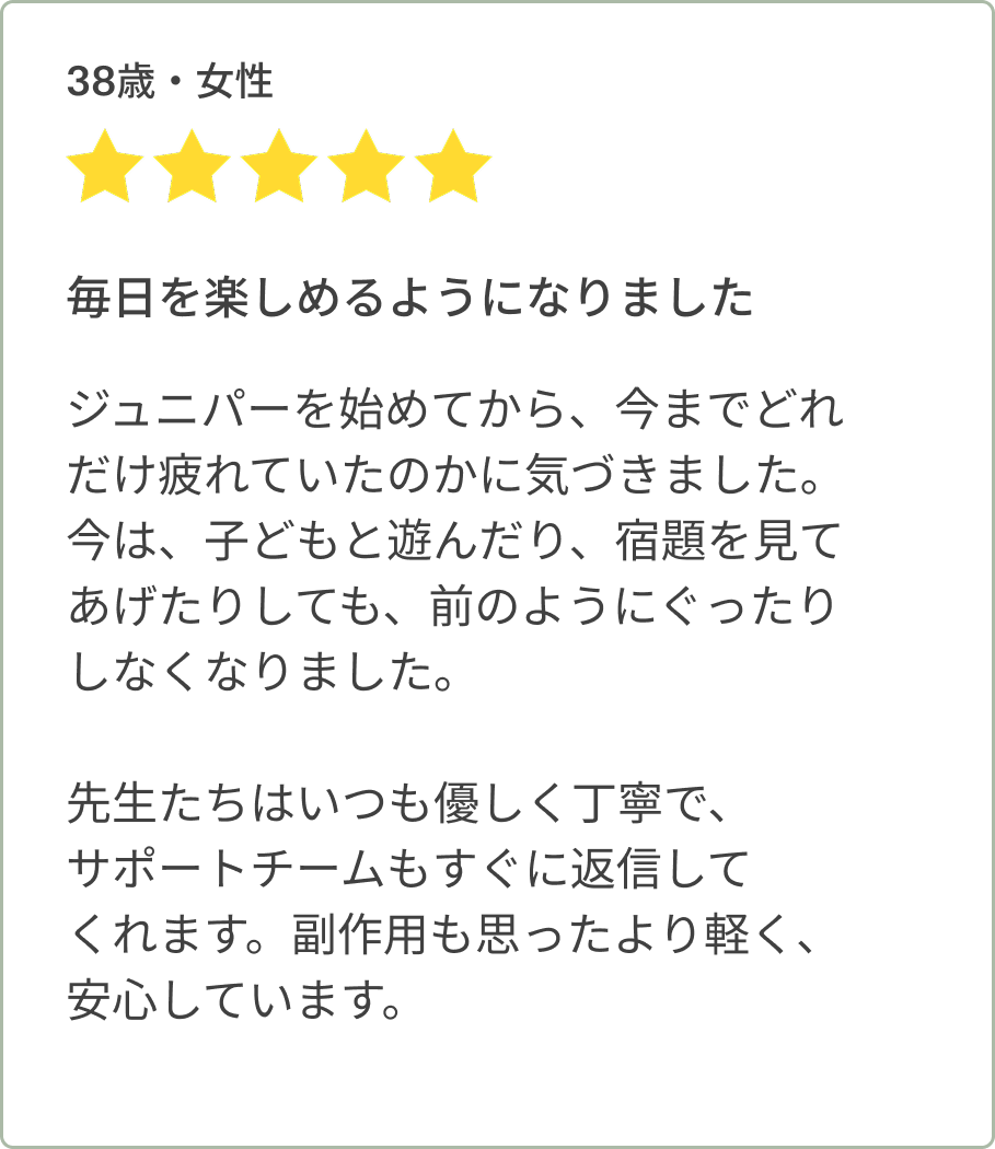 ジュニパーでは、お薬の使用を終了した後も成果を維持できるよう、長期的な生活習慣の改善をサポートしています。